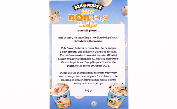 Design and produce a seeding kit to support the relaunch of Ben & Jerry’s Non-Dairy frozen dessert line. The kit should highlight the reformulated oat base and the launch of the new Non-Dairy flavors and be shipped out to influencers to drive awareness and encourage media sharing.