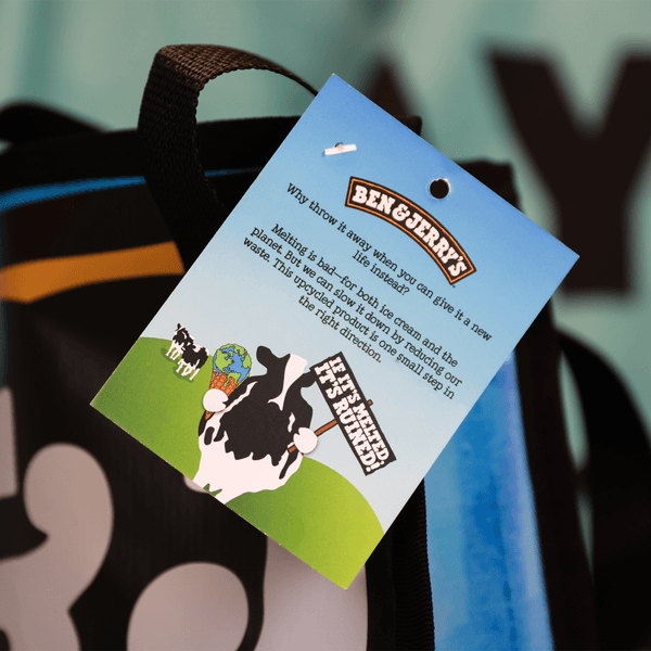 T(H carefully selected the perfect partner in a like-minded, eco-focused upcycling company called Mile High Workshop that specializes in converting old banners and signage into functional (and fashionable) bags. Similar to Greyston Bakery, one of Ben & Jerry’s longtime partners, Mile High Workshop creates employment opportunities for those seeking to rebuild from addictions, homelessness, and incarceration. T(H also designed, copywrote, and produced the custom bag hang tags, and handled all the logistics, communication, and shipping for the program.