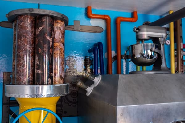 Trigger(House revamped and reconstructed an aging shed on the factory tour property into an eccentric ice cream laboratory, complete with touch-and-play interactives and education-focused design. The exterior of the shed was refinished with materials and custom add-ons, creating a futuristic workshop facade. Inside, the Pint Slice factory came to life through colorful and dimensional design, informative interactives, and graphics. The main feature, an oversized innovation machine, allowed guests to touch, crank, and twist levers, buttons, and wheels as the conveyor belt pumped out Pint Slices.
