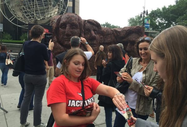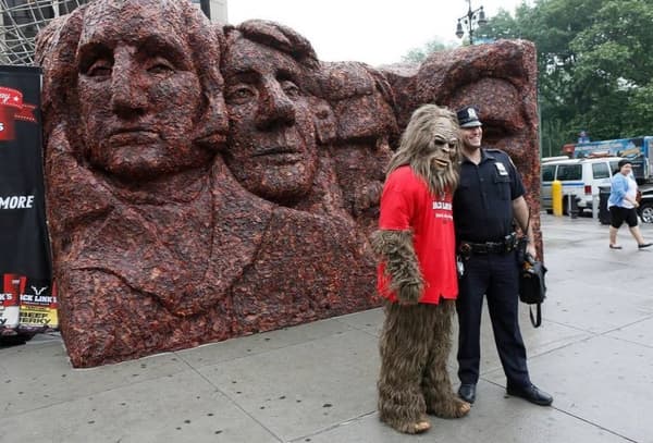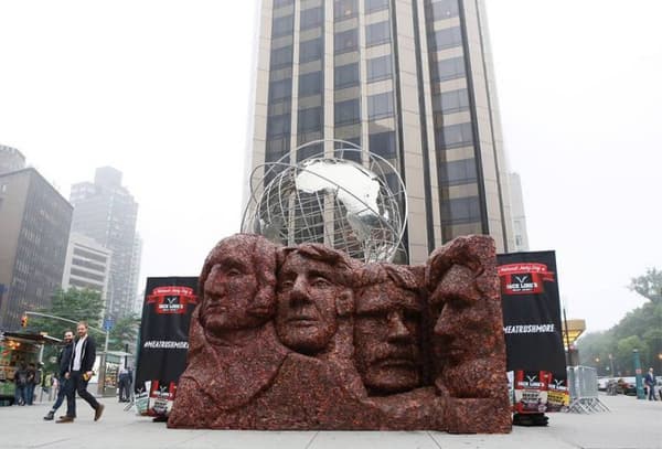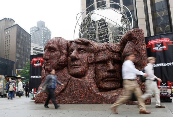 Design and fabricate a beef jerky replica of famous US monument Mt. Rushmore and place it on display in a high-traffic location. On National Jerky Day 2014, Meat Rushmore was unveiled in Columbus Circle. The photo-worthy meat monument was made with nearly one ton of Jack Link’s Beef Jerky, standing 13 feet tall and 17 feet wide. Throughout the day, passersby were encouraged to sample Jack Link’s Jerky and post photos of the phenomenon on their social media sites using #MEATRUSHMORE to enter a sweepstakes.