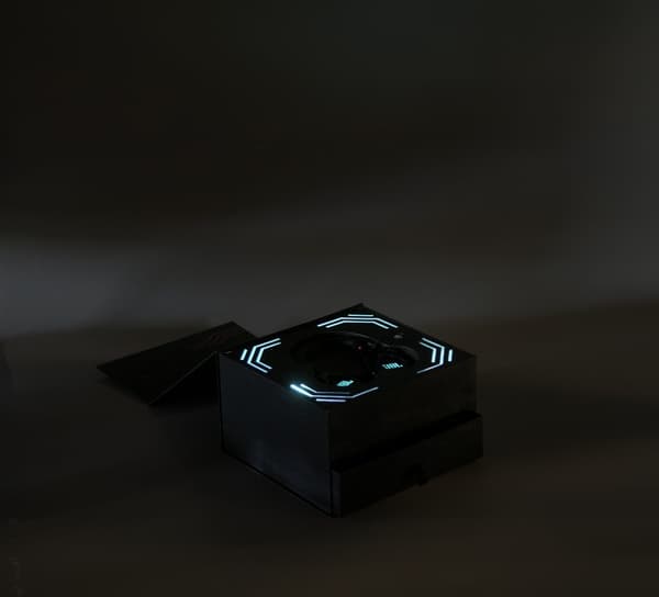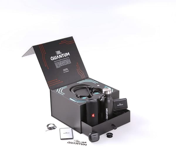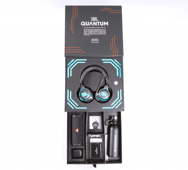 From the sleek, monotone black exterior incorporating reflective JBL horn icons on the exterior to the automatic LED lights that triggered upon opening, the JBL Quantum kits made almost as much of an impression as the headphones they held. Beneath the headphone display, a second drawer opened to reveal a JBL portable speaker and a variety of branded swag boasting 75 years of audio expertise behind each pair of JBL Quantum One headphones.