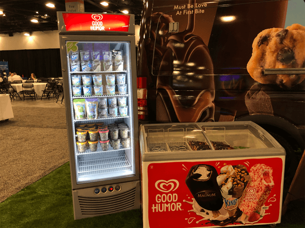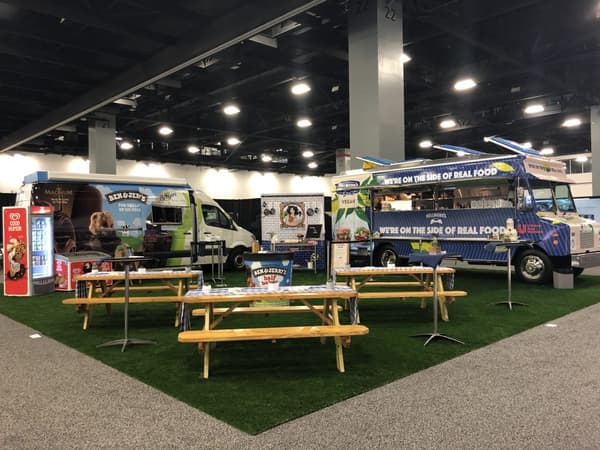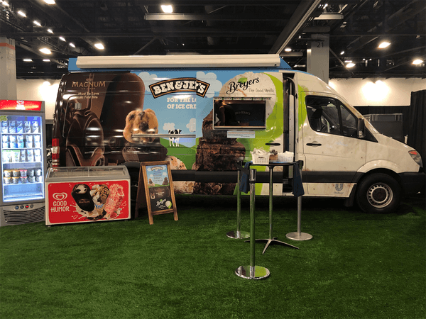 In just 4 weeks, Trigger(House created a 'food truck park' themed booth that included two custom-wrapped food trucks fully equipped to serve samples within the convention center. This non-traditional booth stood out from the other trade show structures/booths found on the convention floor and saw high volumes of foot traffic due to its unique design and sought-after sampling offerings including Ben & Jerry’s Ice Cream and JackFruit Slides made with Helmann’s Vegan Mayonnaise. The open-concept layout allowed for Unilever representatives to interact and host informal sales meetings with potential Burger King franchisee partners, further driving positive sentiment and acquisition for each brand onsite.